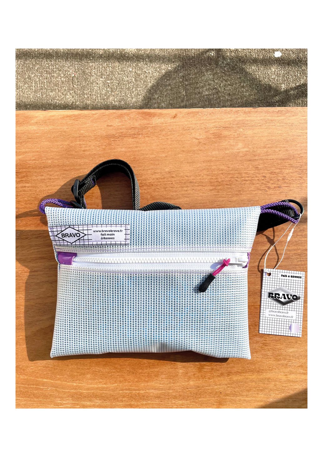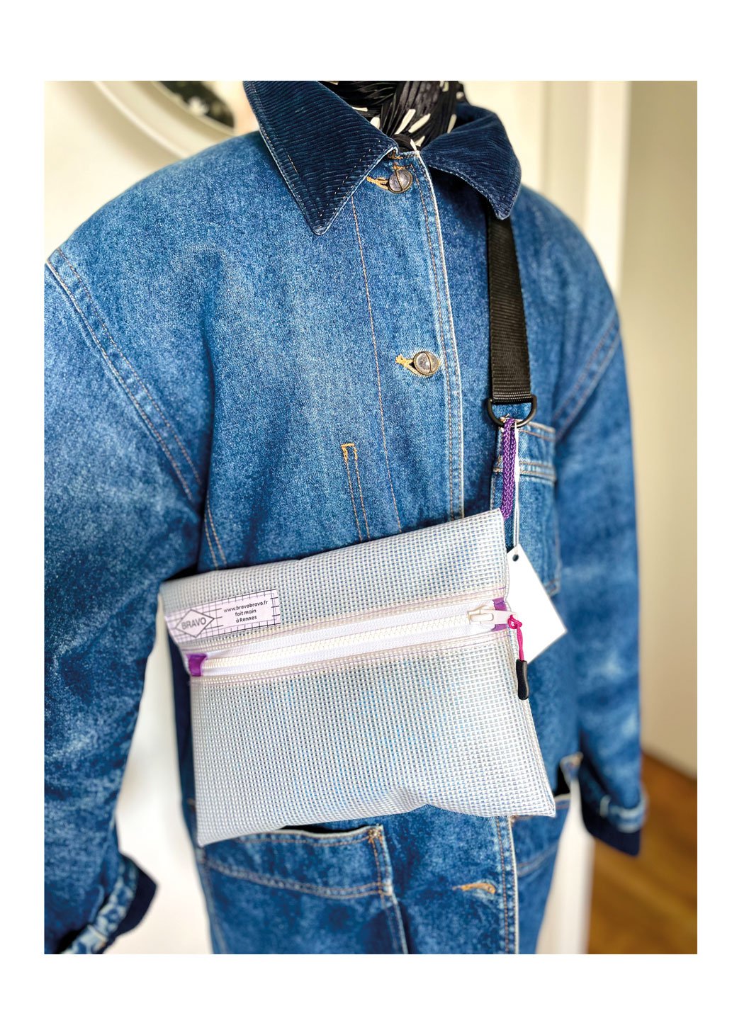 Ce nouvel objet est une pochette plate de grand format. Elle s'ouvre par une fermeture a glissière YKK de 6mm. Elle est de forme rectangulaire et fabriquée avec une toile plastique de haute densité. Elle possède une trame resserrée et un motif quadrillé. Elle est doublée par une toile nylon ou coton. Elle est imperméable. Elle possède de petits liens sur les côtés et une sangle réglable. Elles sont toutes différentes.