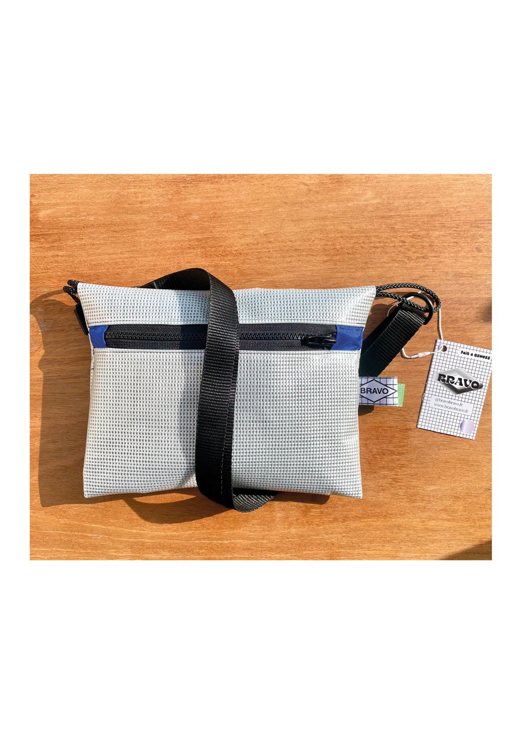 Ce nouvel objet est une pochette plate de grand format. Elle s'ouvre par une fermeture a glissière YKK de 6mm. Elle est de forme rectangulaire et fabriquée avec une toile plastique de haute densité. Elle possède une trame resserrée et un motif quadrillé. Elle est doublée par une toile nylon ou coton. Elle est imperméable. Elle possède de petits liens sur les côtés et une sangle réglable. Elles sont toutes différentes.