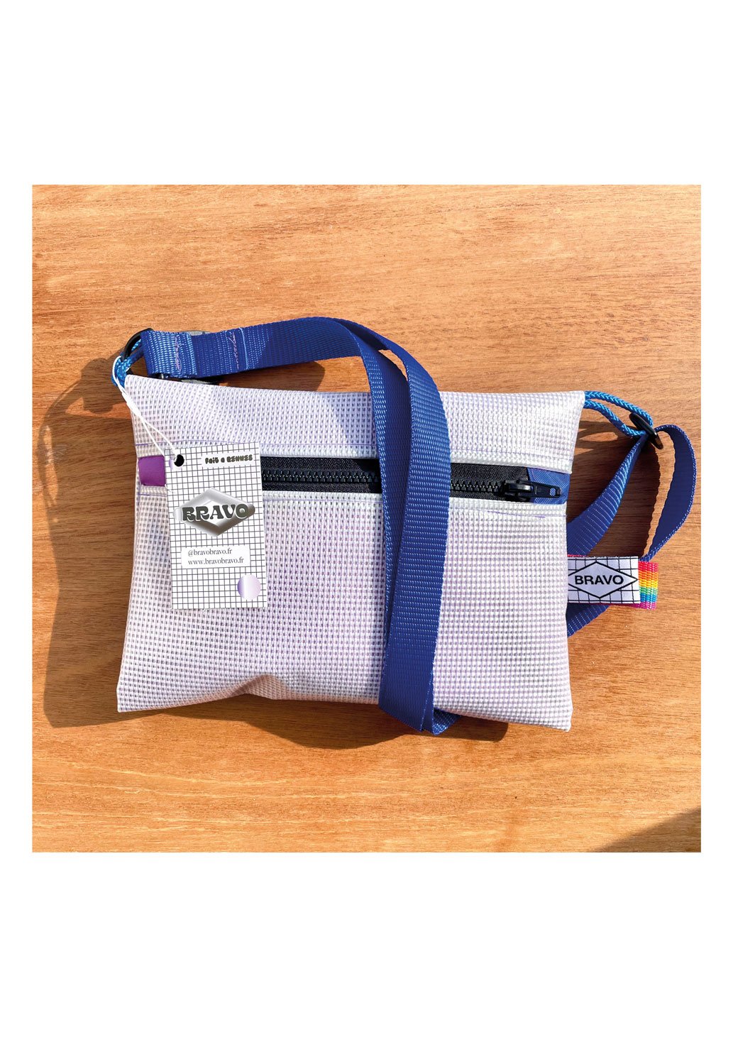 Ce nouvel objet est une pochette plate de grand format. Elle s'ouvre par une fermeture a glissière YKK de 6mm. Elle est de forme rectangulaire et fabriquée avec une toile plastique (bâche) de haute densité. Elle possède une trame resserrée et un motif quadrillé. Elle est doublée par une toile nylon ou coton. Elle est imperméable. Elle possède de petits liens sur les côtés et une sangle réglable. Elles sont toutes différentes.